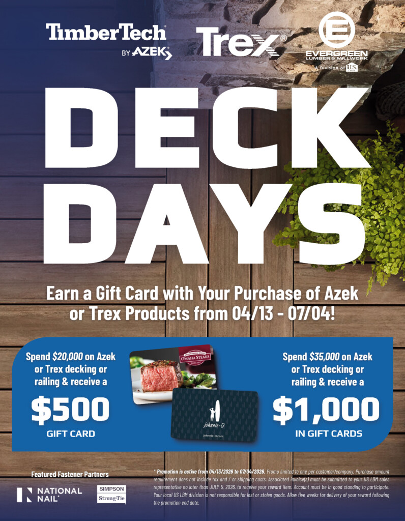 Valid 04/13/2026 – 07/04/2026 at Evergreen Lumber for TimberTech and Trex decking and railing.